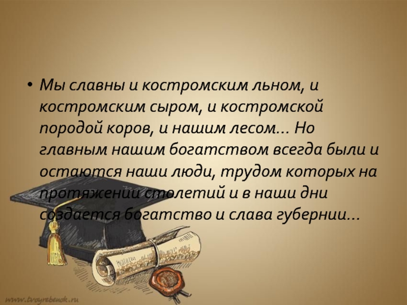 Слайд 11Мы славны и костромским льном, и костромским сыром, и костромской