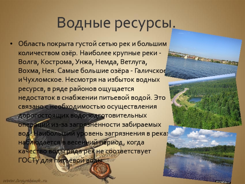 Нея. Самые большие озёра - Галичское и Чухломское. Несмотря на избыток водных ресурсв, в ряде районов ощущается недостаток в снабжении питьевой водой. Это связано с необходимостью осуществления дорогостоящих водоподготовительных операций из-за загрязнённости забираемых вод. Наибольший уровень загрязнения в реках наблюдается в весенний период, когда качество воды ряда рек не соответствует ГОСТу для питьевой воды.