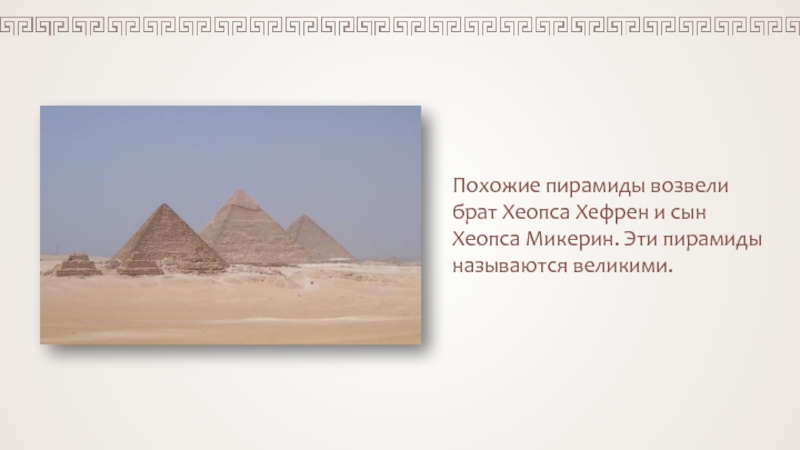 Похожие пирамиды возвели брат Хеопса Хефрен и сын Хеопса Микерин. Эти пирамиды называются великими.