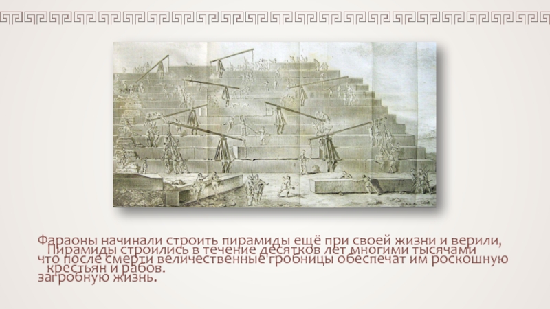 Слайд 18Фараоны начинали строить пирамиды ещё при своей жизни и верили,