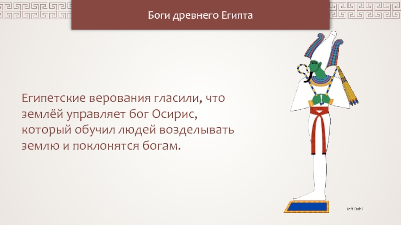 Боги древнего ЕгиптаЕгипетские верования гласили, что землёй управляет бог Осирис, который обучил людей возделывать землю и поклонятся
