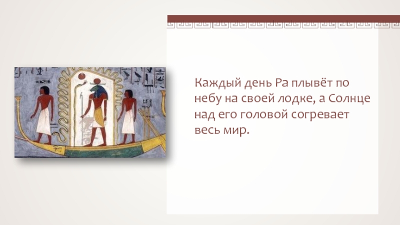 Слайд 2Каждый день Ра плывёт по небу на своей лодке, а