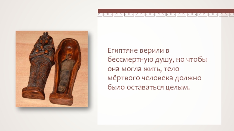 Египтяне верили в бессмертную душу, но чтобы она могла жить, тело мёртвого человека должно было оставаться целым.