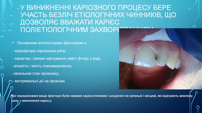 Слайд 5У виникненні каріозного процесу бере участь безліч етіологічних чинників, що
