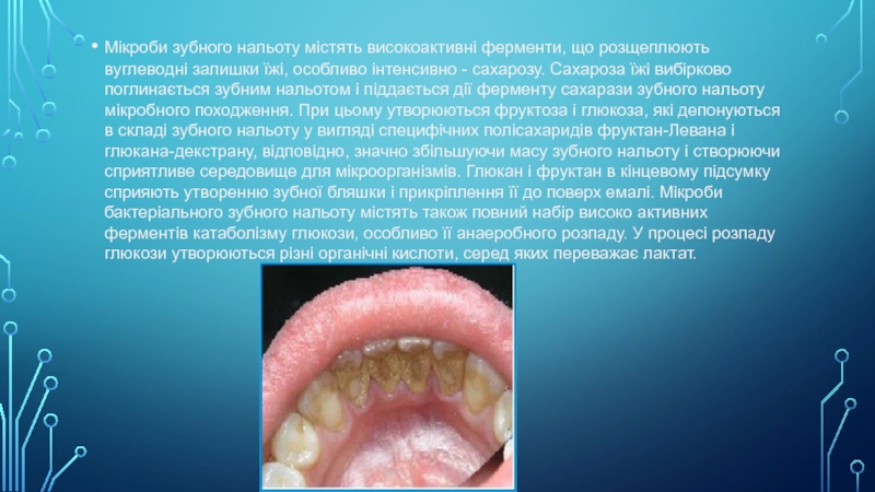 Слайд 3Мікроби зубного нальоту містять високоактивні ферменти, що розщеплюють вуглеводні залишки