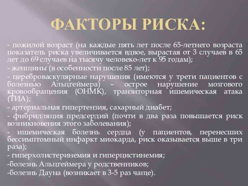 - цереброваскулярные нарушения (имеются у трети пациентов с болезнью Альцгеймера) – острое нарушение мозгового кровообращения (ОНМК), транзиторная ишемическая атака (ТИА);