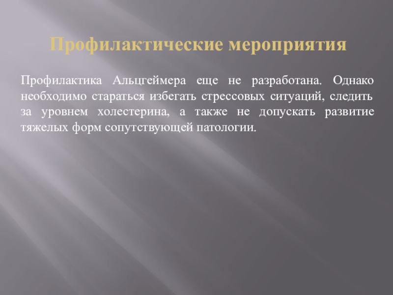 Профилактика Альцгеймера еще не разработана. Однако необходимо стараться избегать
