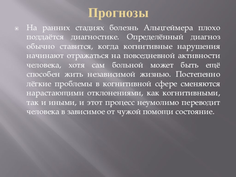 человека, хотя сам больной может быть ещё способен жить независимой жизнью. Постепенно лёгкие проблемы в когнитивной сфере сменяются нарастающими отклонениями, как когнитивными, так и иными, и этот процесс неумолимо переводит человека в зависимое от чужой помощи состояние.