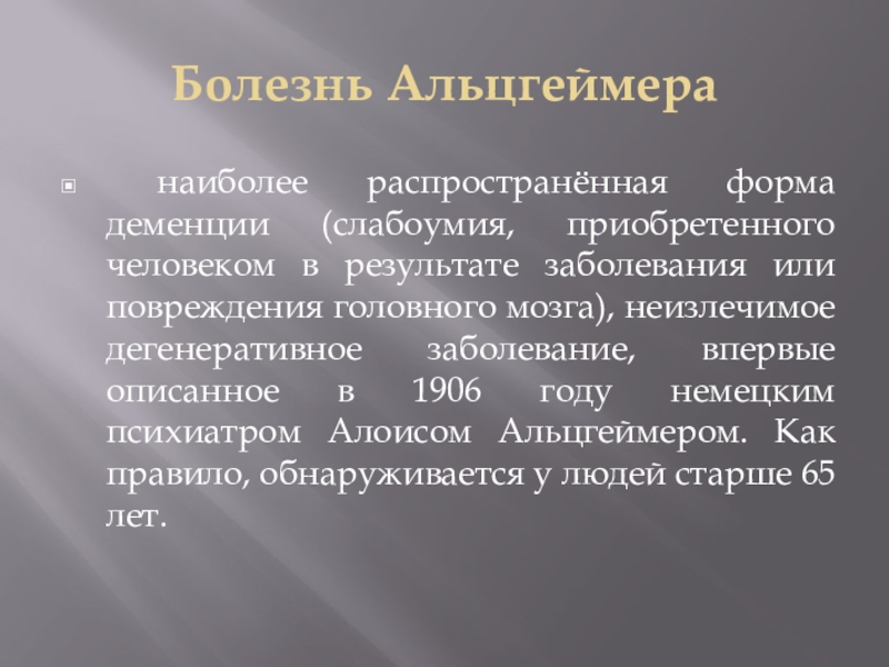 описанное в 1906 году немецким психиатром Алоисом Альцгеймером. Как правило, обнаруживается у людей старше 65 лет.