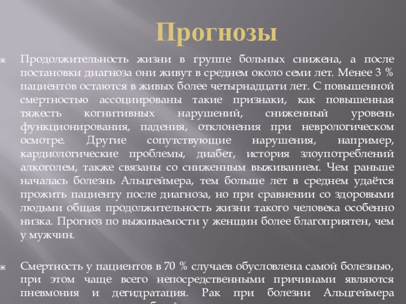пациентов остаются в живых более четырнадцати лет. С повышенной смертностью ассоциированы такие признаки, как повышенная тяжесть когнитивных нарушений, сниженный уровень функционирования, падения, отклонения при неврологическом осмотре. Другие сопутствующие нарушения, например, кардиологические проблемы, диабет, история злоупотреблений алкоголем, также связаны со сниженным выживанием. Чем раньше началась болезнь Альцгеймера, тем больше лет в среднем удаётся прожить пациенту после диагноза, но при сравнении со здоровыми людьми общая продолжительность жизни такого человека особенно низка. Прогноз по выживаемости у женщин более благоприятен, чем у мужчин.