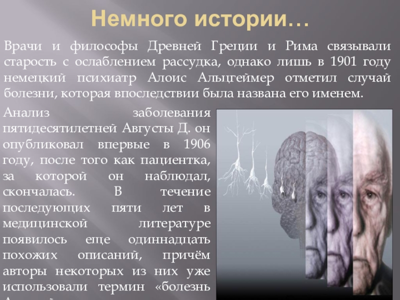 Врачи и философы Древней Греции и Рима связывали старость с ослаблением рассудка, однако лишь в 1901 году немецкий психиатр Алоис Альцгеймер отметил случай болезни, которая впоследствии была названа его именем.