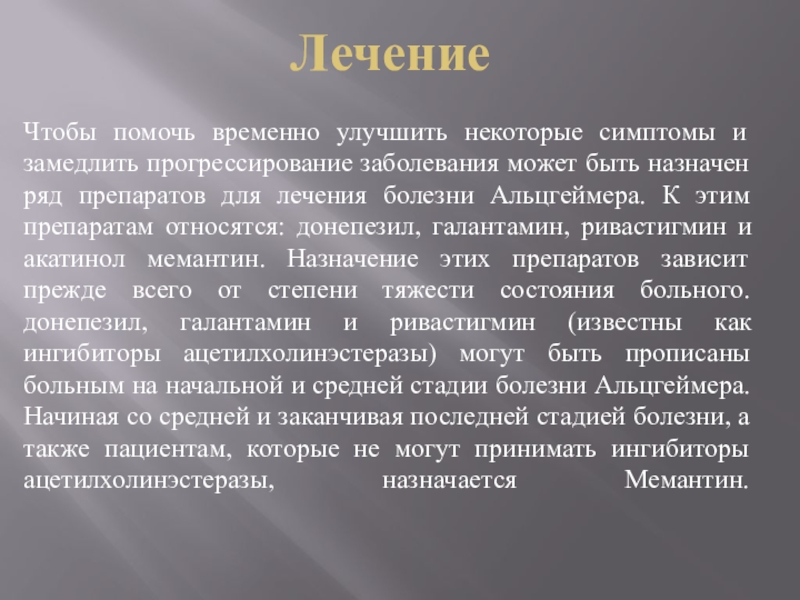 этим препаратам относятся: донепезил, галантамин, ривастигмин и акатинол мемантин. Назначение этих препаратов зависит прежде всего от степени тяжести состояния больного. донепезил, галантамин и ривастигмин (известны как ингибиторы ацетилхолинэстеразы) могут быть прописаны больным на начальной и средней стадии болезни Альцгеймера. Начиная со средней и заканчивая последней стадией болезни, а также пациентам, которые не могут принимать ингибиторы ацетилхолинэстеразы, назначается Мемантин.