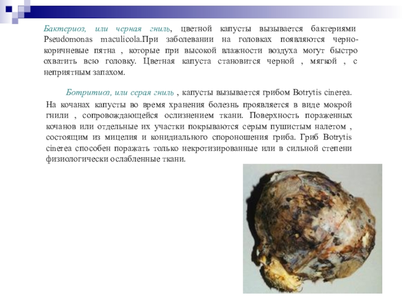 Бактериоз, или черная гниль, цветной капусты вызывается бактериями Pseudomonas maculicola.При заболевании на головках появляются черно-коричневые пятна , которые при высокой влажности воздуха могут быстро охватить всю головку. Цветная капуста становится черной , мягкой , с неприятным запахом.