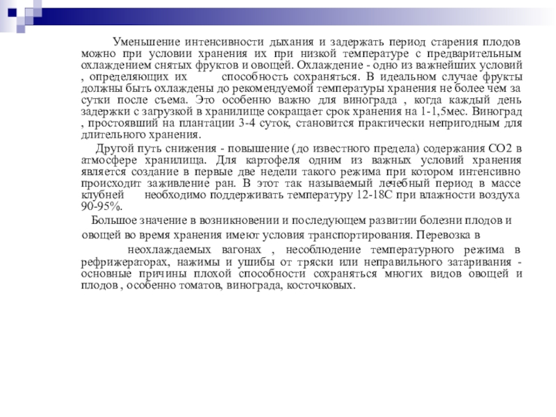 неохлаждаемых вагонах , несоблюдение температурного режима в рефрижераторах, нажимы и ушибы от тряски или неправильного затаривания - основные причины плохой способности сохраняться многих видов овощей и плодов , особенно томатов, винограда, косточковых.