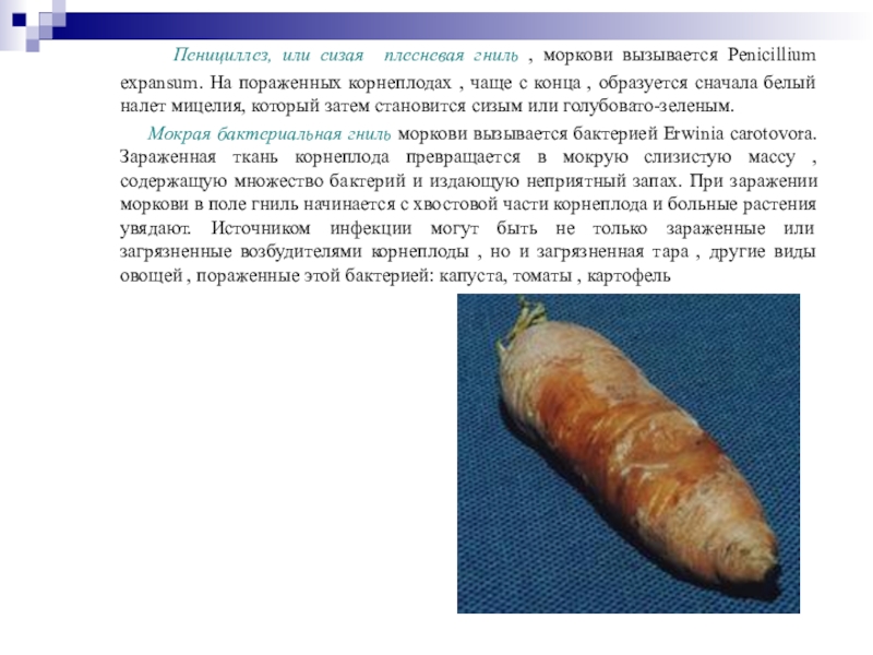 Слайд 29 Пенициллез, или сизая плесневая гниль , моркови
