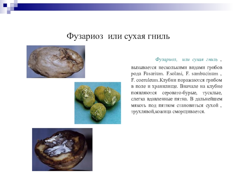 sambucinum , F. coeruleum.Клубни поражаются грибом в поле и хранилище. Вначале на клубне появляются серовато-бурые, тусклые, слегка вдавленные пятна. В дальнейшем мякоть под пятном становиться сухой , трухлявой,кожица сморщивается.