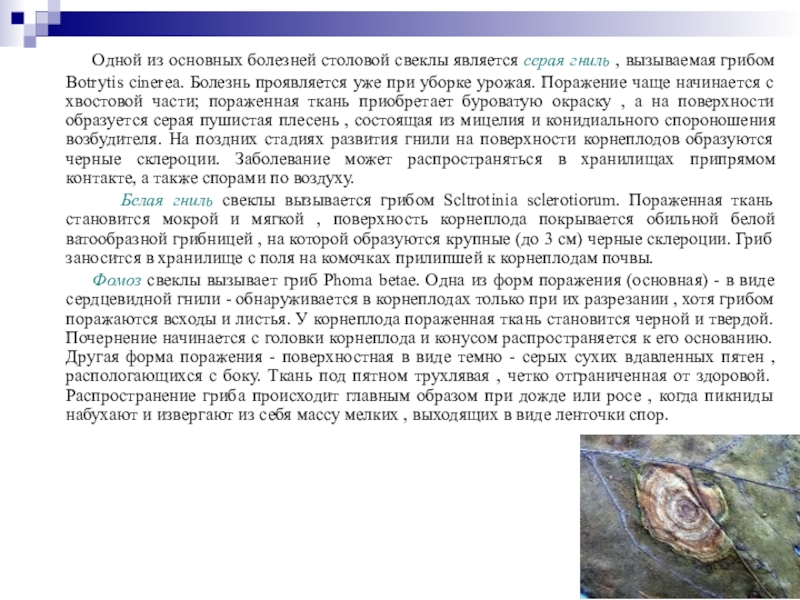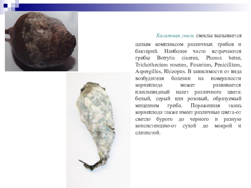 сельскохозяйственные растения. На моркови гриб вызывает типичную мокрую гниль. Пораженная ткань становится мягкой , мокрой , как и при белой гнили , но приобретает в отличии от нее буроватый цвет. На поверхности корнеплода развивается обильный серый налет , состоящий из мицелия и конидиального спороношения. Первичное заражение может произойти как в поле , так и в хранилище. Дальнейшее распространение происходит конидиями , переносимыми потоком воздуха ; гниль может распространятся на разные участки.