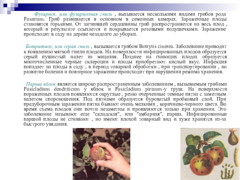 Парша яблок является широко распространенным заболеванием , вызываемым грибами Fusicladium dendriticum у яблок и Fusicladium pirinum-y груш. На поверхности пораженных плодов появляются округлые , резко очерченные темные пятна с заметным налетом спороношения. Под пятнами образуется буроватый пробковый слой. При предуборочным заражении пятна бывают очень мелкими , коричнево-черного цвета. Во время съема плодов они почти незаметны и проявляются только при хранении. Это заболевание называют еще "складская", или "амбарная", парша. Инфицированные паршой плоды не сгнивают , но имеют плохой товарный вид и хуже хранятся из-за быстрого увядания.