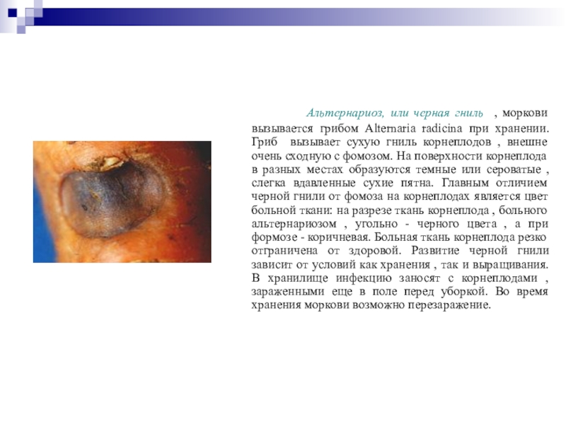 , внешне очень сходную с фомозом. На поверхности корнеплода в разных местах образуются темные или сероватые , слегка вдавленные сухие пятна. Главным отличием черной гнили от фомоза на корнеплодах является цвет больной ткани: на разрезе ткань корнеплода , больного альтернариозом , угольно - черного цвета , а при формозе - коричневая. Больная ткань корнеплода резко отграничена от здоровой. Развитие черной гнили зависит от условий как хранения , так и выращивания. В хранилище инфекцию заносят с корнеплодами , зараженными еще в поле перед уборкой. Во время хранения моркови возможно перезаражение.