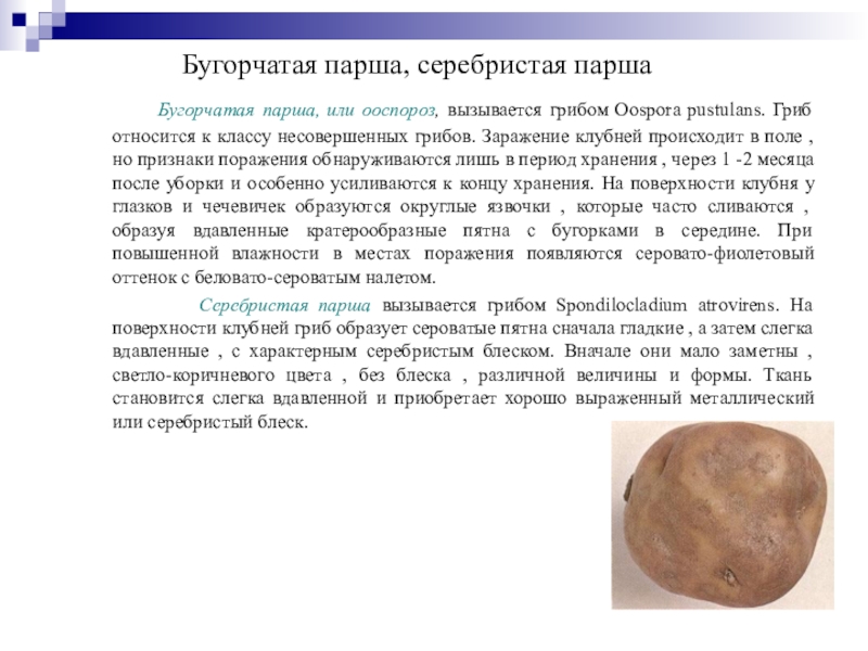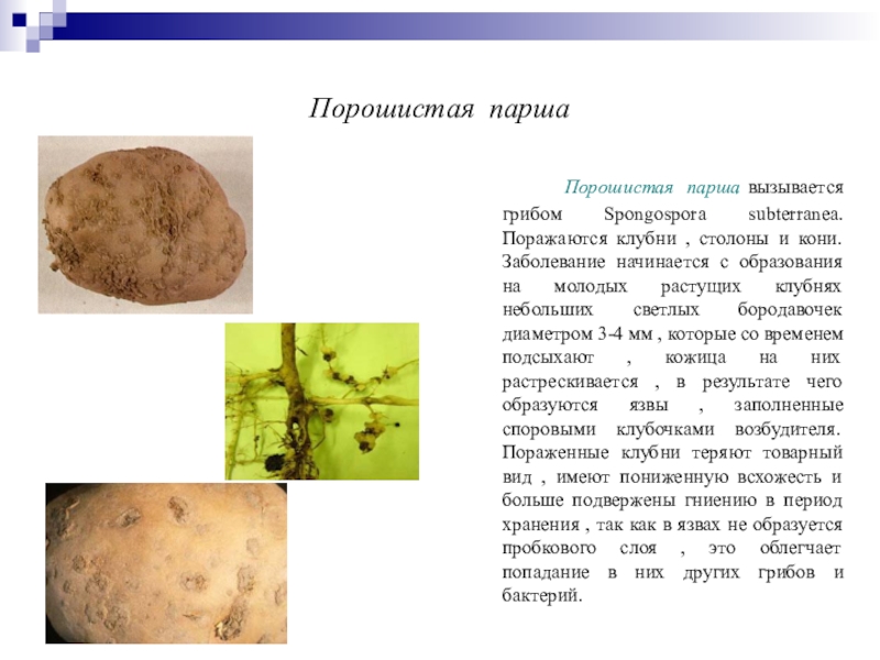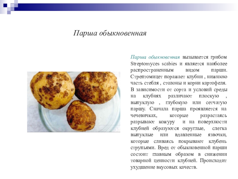 , нижнюю часть стебля , столоны и корни картофеля. В зависимости от сорта и условий среды на клубнях различают плоскую , выпуклую , глубокую или сетчатую паршу. Сначала парша проявляется на чечевичках, которые разрастаясь разрывают кожуру и на поверхности клубней образуются округлые, слегка выпуклые или вдавленные язвочки, которые сливаясь покрывают клубень струпьями. Вред от обыкновенной парши состоит главным образом в снижении товарной ценности клубней. Происходит ухудшение вкусовых качеств.