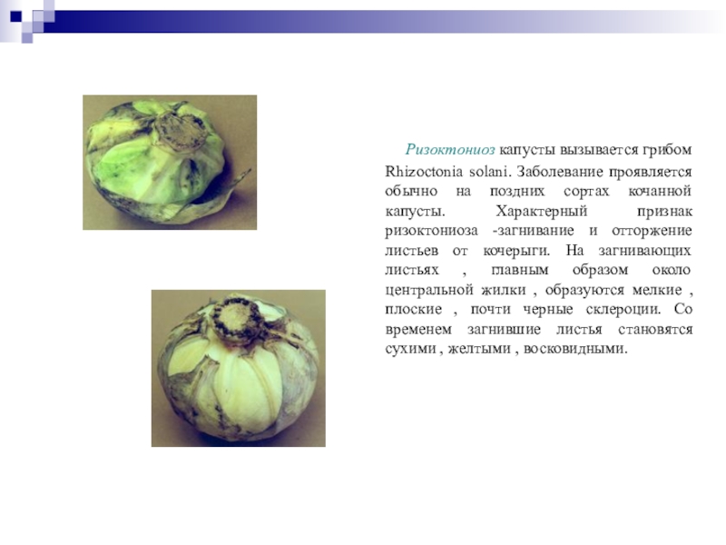 Слайд 33 Ризоктониоз капусты вызывается грибом Rhizoctonia solani. Заболевание