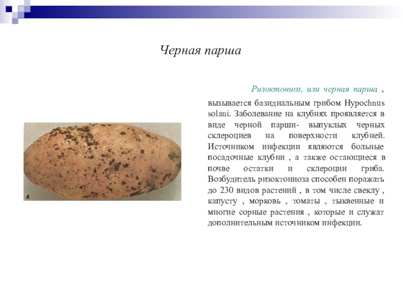 черной парши- выпуклых черных склероциев на поверхности клубней. Источником инфекции являются больные посадочные клубни , а также остающиеся в почве остатки и склероции гриба. Возбудитель ризоктониоза способен поражать до 230 видов растений , в том числе свеклу , капусту , морковь , томаты , тыквенные и многие сорные растения , которые и служат дополнительным источником инфекции.