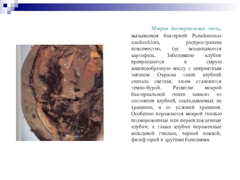 сырую кашицеобразную массу с неприятным запахом. Окраска таких клубней сначала светлая, затем становится темно-бурой. Развитие мокрой бактериальной гнили зависит от состояния клубней, закладываемых на хранение, и от условий хранения. Особенно поражаются мокрой гнилью подмороженные или переохлажденные клубни, а также клубни пораженные кольцевой гнилью, черной ножкой, фитофторой и другими болезнями.
