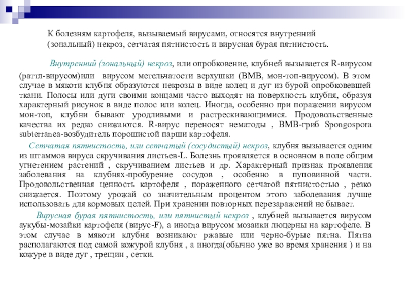 Слайд 20К болезням картофеля, вызываемый вирусами, относятся внутренний (зональный) некроз, сетчатая