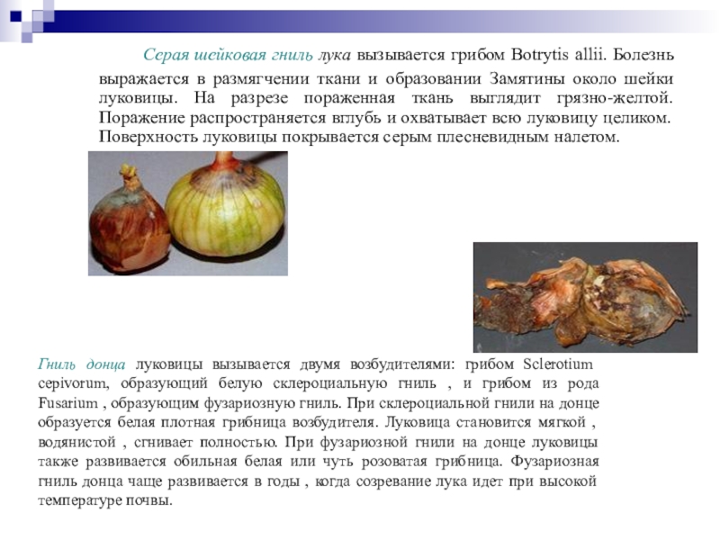 Слайд 37Гниль донца луковицы вызывается двумя возбудителями: грибом Sclerotium cepivorum, образующий