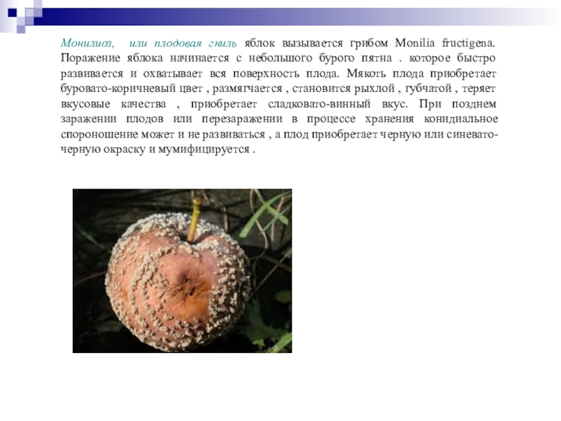 Слайд 40Монилиоз, или плодовая гниль яблок вызывается грибом Monilia fructigena. Поражение