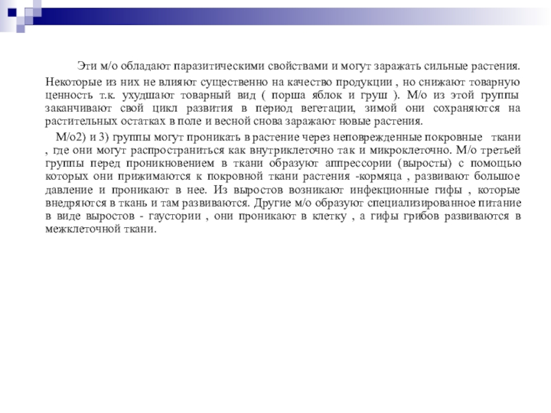 на качество продукции , но снижают товарную ценность т.к. ухудшают товарный вид ( порша яблок и груш ). М/о из этой группы заканчивают свой цикл развития в период вегетации, зимой они сохраняются на растительных остатках в поле и весной снова заражают новые растения.
