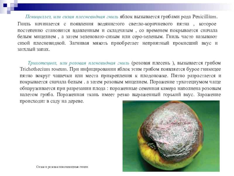 Трихотециоз, или розовая пленевидная гниль (розовая плесень ), вызывается грибом Trichothecium roseum. При инфицировании яблок этим грибом появляется бурое гниющее пятно вокруг чашечки или места прикрепления к плодоножке. Пятно разрастается и покрывается сначала белым . а затем розовым мицелием. Поражение трхотециумом чаще обнаруживается при разрезании плода : пораженные семенная камера наполнена розовым налетом гриба. Пораженная ткань имеет резко выраженный горький вкус. Заражение происходит в саду на дереве.