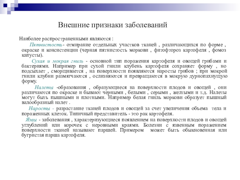тканей , различающихся по форме , окраске и консистенции (черная пятнистость моркови , фитофтороз картофеля , фомоз капусты).