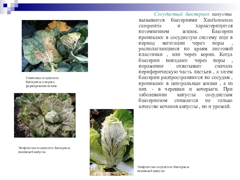 жилок. Бактерии проникают в сосудистую систему еще в период вегетации через поры , располагающиеся по краям листовой пластинки , или через корни. Когда бактерии попадают через поры , поражение охватывает сначала периферическую часть листьев , а затем бактерии распространяются по сосудам , проникают в центральные жилки , а из них - в черешки и кочерыги. При заболевании капусты сосудистым бактериозом снижается не только качество кочанов капусты , но и урожай.