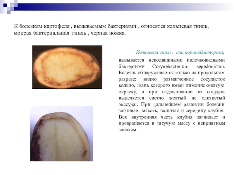 Слайд 17К болезням картофеля , вызываемым бактериями , относятся кольцевая гниль,