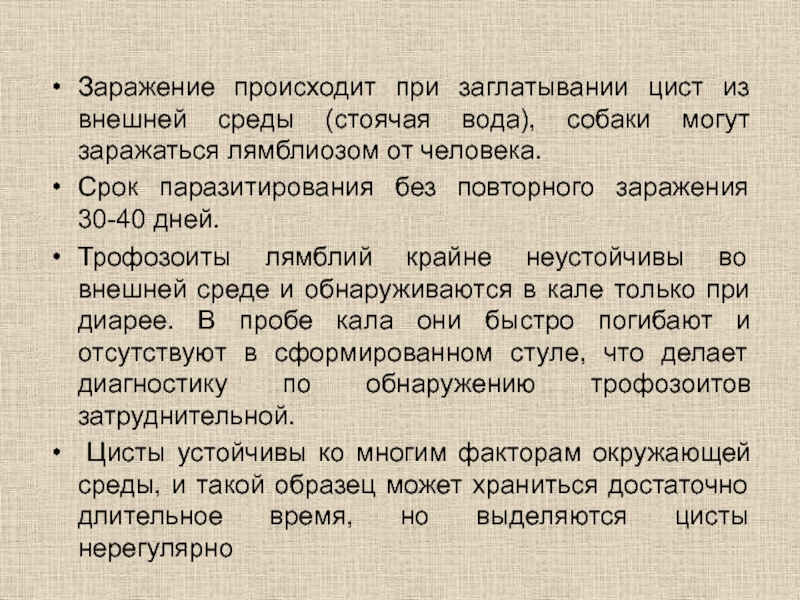 Заражение алиментарно при заглатывании трофозоита с водой,