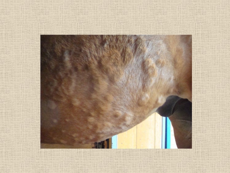 области крупа, живота, по бокам груди круглые и кольцевидные припухлости