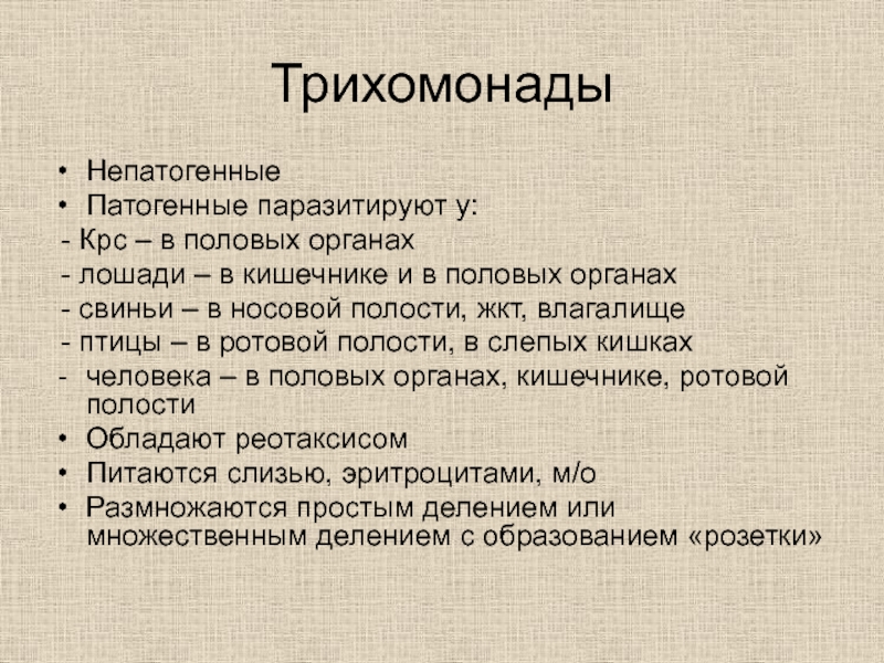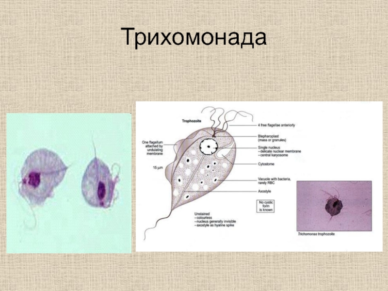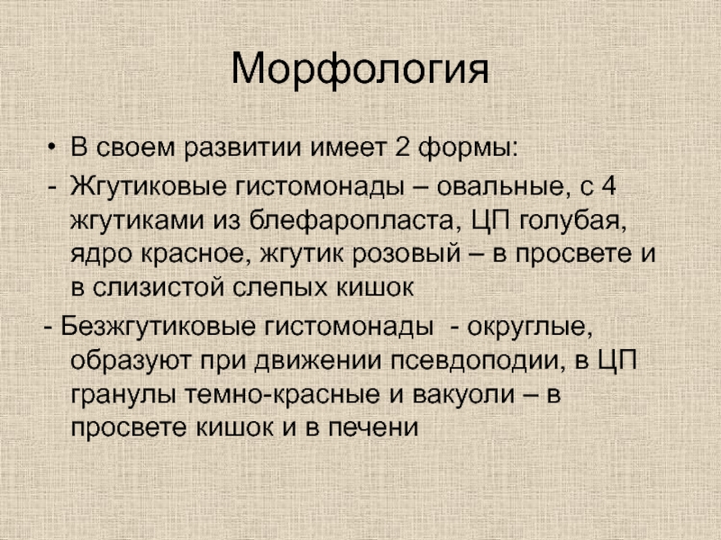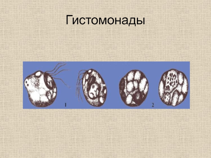 - Безжгутиковые гистомонады - округлые, образуют при движении псевдоподии, в ЦП гранулы темно-красные и вакуоли – в просвете кишок и в печени