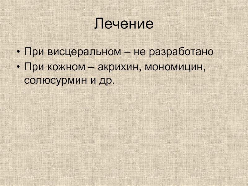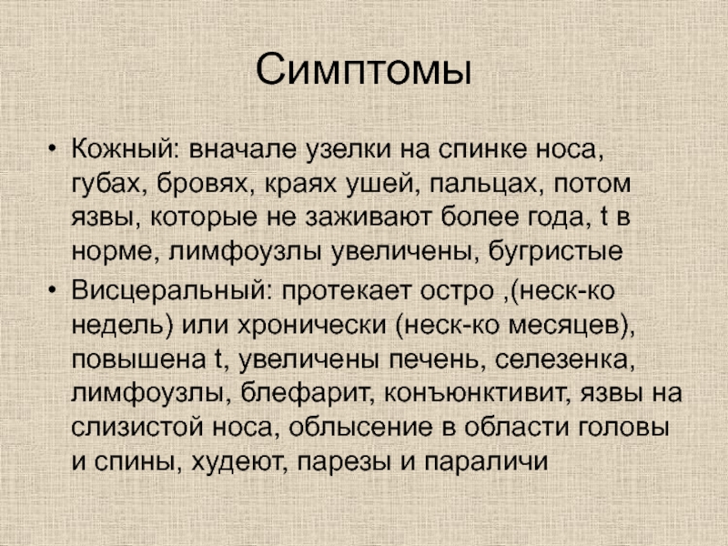 Висцеральный: протекает остро ,(неск-ко недель) или хронически (неск-ко месяцев), повышена t, увеличены печень, селезенка, лимфоузлы, блефарит, конъюнктивит, язвы на слизистой носа, облысение в области головы и спины, худеют, парезы и параличи