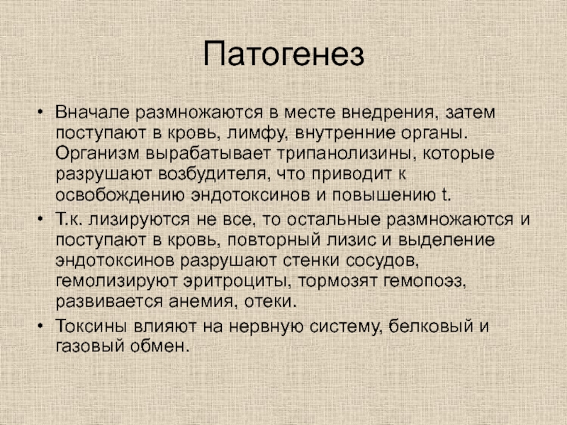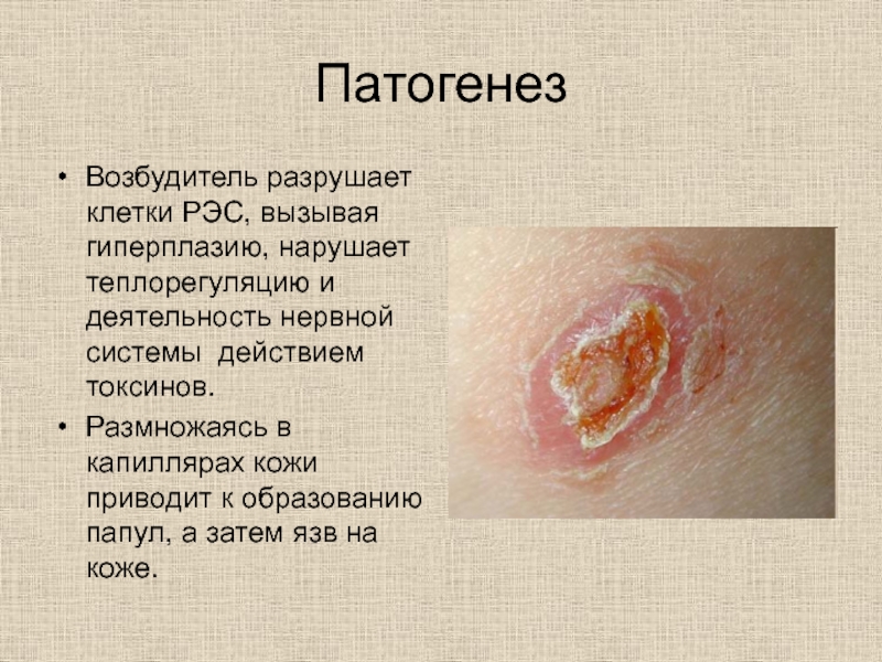Возбудитель разрушает клетки РЭС, вызывая гиперплазию, нарушает теплорегуляцию и деятельность