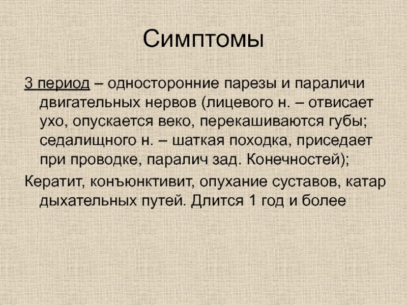 3 период – односторонние парезы и параличи двигательных нервов (лицевого