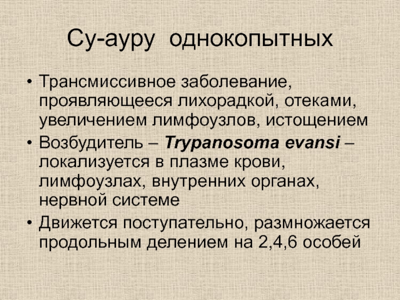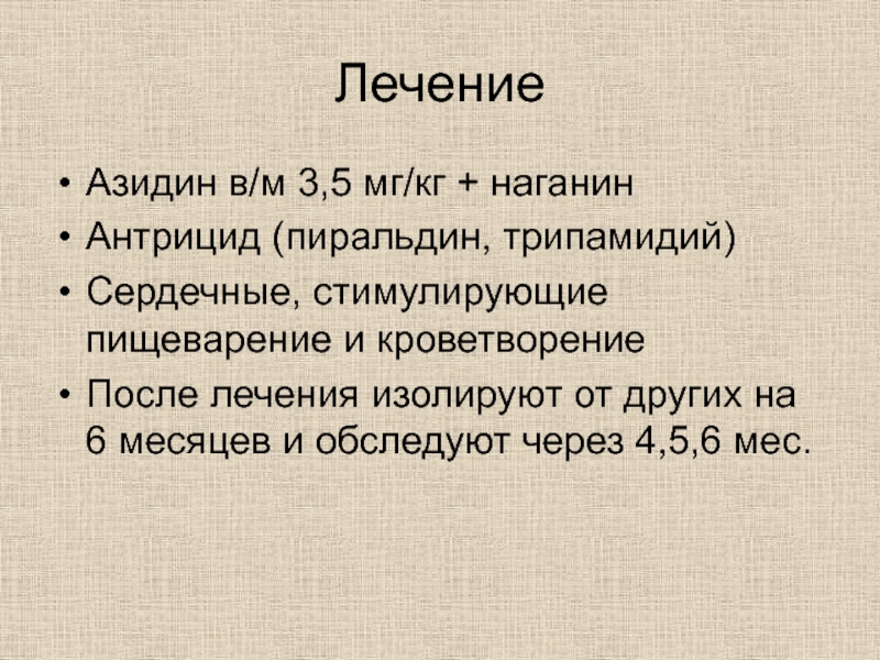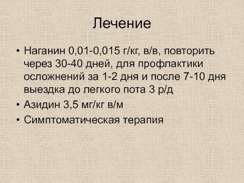 Наганин 0,01-0,015 г/кг, в/в, повторить через 30-40 дней, для