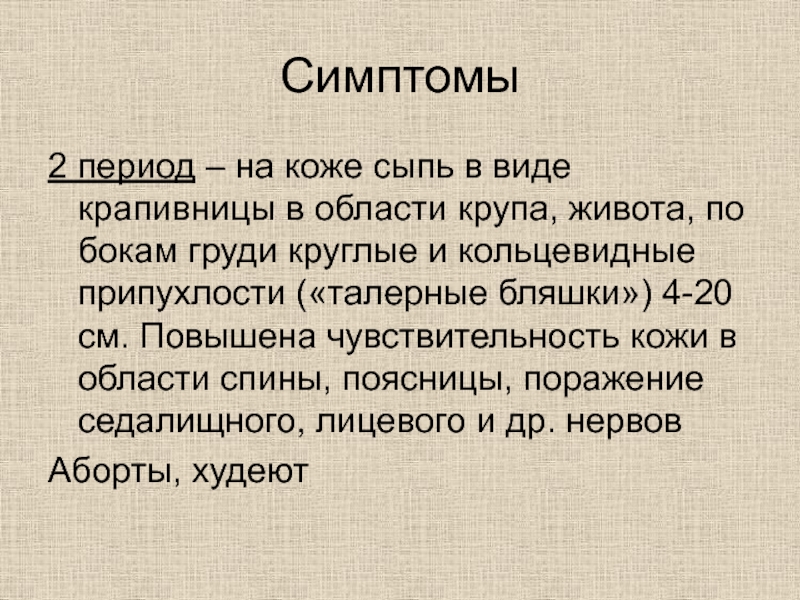 («талерные бляшки») 4-20 см. Повышена чувствительность кожи в области спины, поясницы, поражение седалищного, лицевого и др. нервов