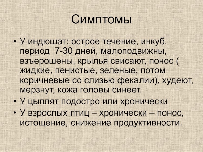 У индюшат: острое течение, инкуб. период 7-30 дней, малоподвижны, взъерошены,