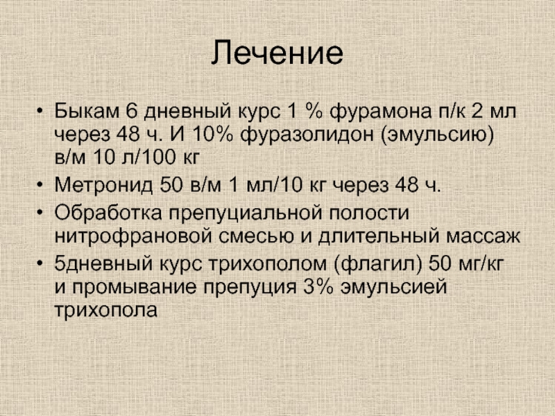 5дневный курс трихополом (флагил) 50 мг/кг и промывание препуция 3% эмульсией трихопола