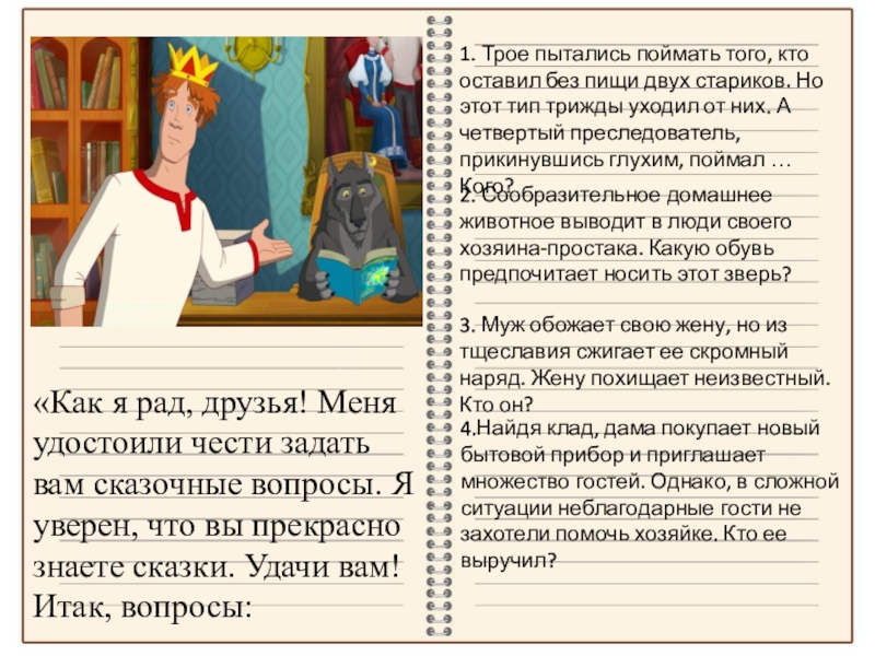 1. Трое пытались поймать того, кто оставил без пищи двух стариков. Но этот тип трижды уходил от них. А четвертый преследователь, прикинувшись глухим, поймал … Кого?