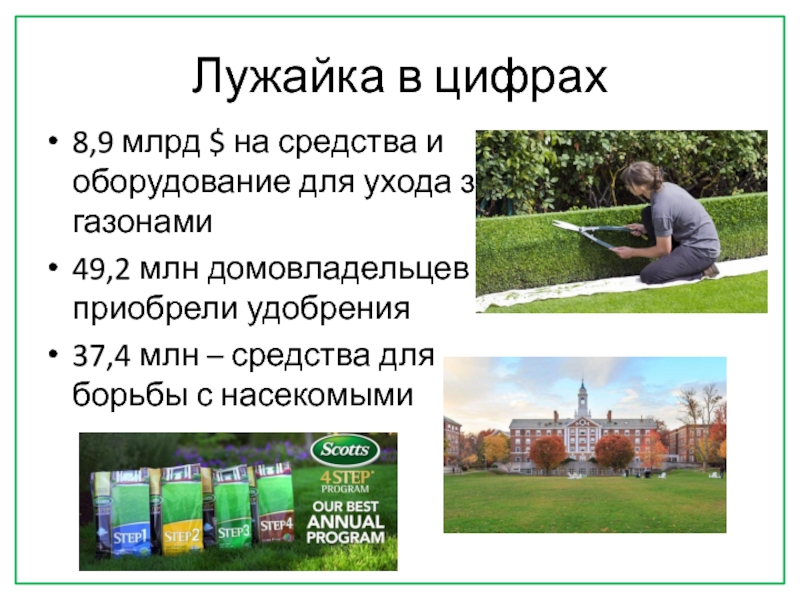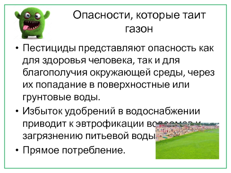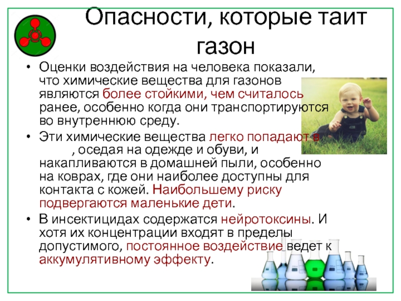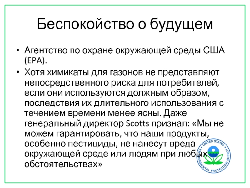 они используются должным образом, последствия их длительного использования с течением времени менее ясны. Даже генеральный директор Scotts признал: «Мы не можем гарантировать, что наши продукты, особенно пестициды, не нанесут вреда окружающей среде или людям при любых обстоятельствах»