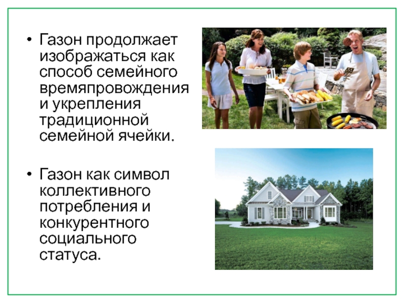 Слайд 24Газон продолжает изображаться как способ семейного времяпровождения и укрепления традиционной