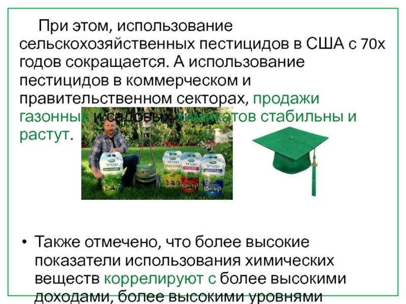 Слайд 19 При этом, использование сельскохозяйственных пестицидов в США с 70х