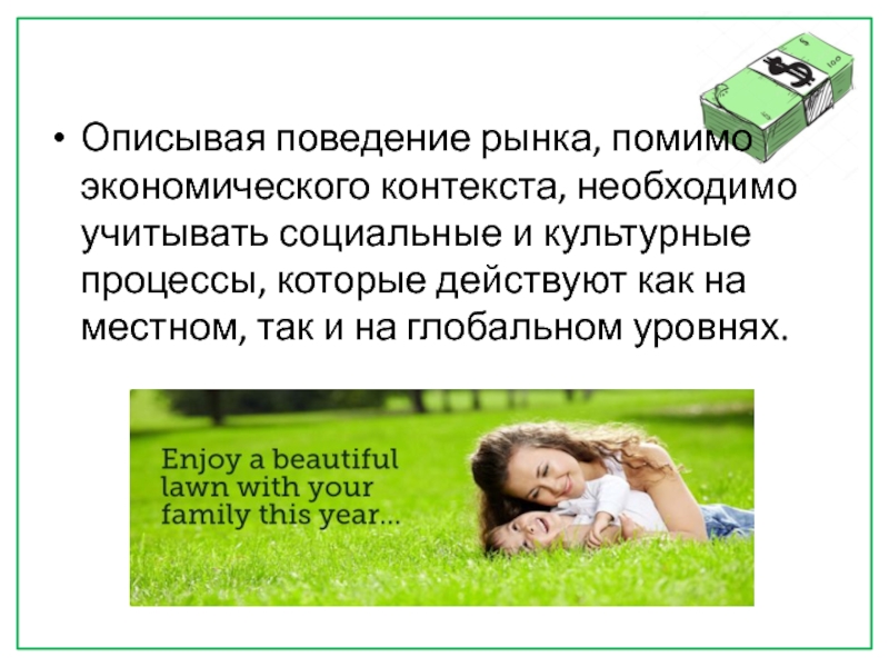 Слайд 28Описывая поведение рынка, помимо экономического контекста, необходимо учитывать социальные и